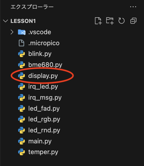左側のエクスプローラにて右クリックして、「新しいファイル」を選択します。ファイル名を入力する欄が表示されるので、適当に名前を入力します。今回は、「display.py」としました。