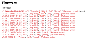 Firmware→Releasesから、v1.25.0と表示されている拡張子が「.bin」のものをクリックすると、PCにダウンロードされます。最新版は、latestと表示されているv1.26.0ですが、動作が不安定なので、今回はv1.25.0を使います。