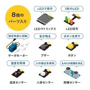 - 8種類のパーツ(LEDマトリックス / LED信号 / サーボモーター / ブザー / ボタン / 温度センサー / 人感センサー / 距離センサー)
