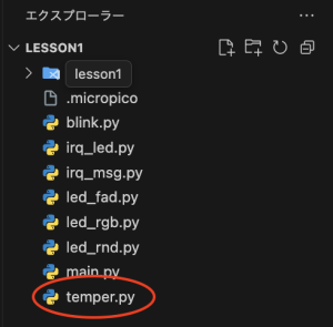 左側のエクスプローラにて右クリックして、「新しいファイル」を選択します。ファイル名を入力する欄が表示されるので、適当に名前を入力します。今回は、「temper.py」としました。